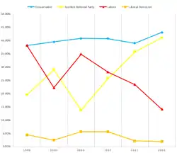 Historically the Ayr seat has held a higher level of support for the Conservative Party in comparison to elsewhere in Scotland and the United Kingdom as a whole. The equivalent Westminster constituency of Ayr was gained by the Conservative Party at its creation in 1950. In subsequent elections the seat went on to return Conservative MP's to Parliament until the 1997 UK general election, when the boundaries of the constituency were altered in a move involving the transfer of a number of Conservative-voting suburbs towards the south of Ayr to the adjoining Carrick, Cumnock and Doon Valley constituency, which subsequently altered the demographics of the Ayr constituency - benefiting the Labour Party. In spite of this, at the 1997 election, the Ayr seat returned one of the smallest pro-Labour swings in Great Britain at just over 5%.[6] Prior to this the Ayr Burghs constituency (which incorporated a number of towns in coastal Ayrshire including Irvine, Troon, Prestwick, Ayr, Saltcoats and Ardrossan) continuously returned Conservative MP's to Parliament from 1906 until its abolishment in 1950, making Ayr the longest seat to be held continuously by the Conservatives in Scotland (continuously having a Conservative MP at Westminster for 91 years).