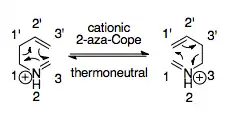 The first example of an aza-Cope rearrangement was the ubiquitous cationic 2-aza-Cope rearrangement, which takes place at temperatures 100-200 °C lower than the Cope rearrangement due to the facile nature of the rearrangement.[2] The facile nature of this rearrangement is attributed both to the fact that the cationic 2-aza-Cope is inherently thermoneutral, meaning there's no bias for the starting material or product, as well as to the presence of the charged heteroatom in the molecule, which lowers the activation barrier. Less common are the 1-aza-Cope rearrangement and the 3-aza-Cope rearrangement, which are the microscopic reverse of each other. The 1- and 3-aza-Cope rearrangements have high activation barriers and limited synthetic applicability, accounting for their relative obscurity.[3][4][5]
