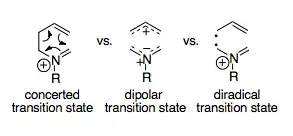 The first discovered 1-aza-Cope reaction was a simple analog to the generic Cope reaction and required intense heat to overcome its large thermodynamic activation barrier; most subsequent work on the 1-aza-Cope rearrangement has thus focused on pairing the arrangement with a driving thermodynamic force to avoid these harsh reaction conditions. It has been hypothesized that the 1-aza-Cope rearrangement rate-determining transition state has partial diradical and dipolar transition state character due to the presence of the heteroatom.[4]