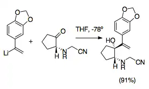 Cyanomethyl groups represent an easy way to protect an iminium ion during allylic vinylation of the ketone. Cyanamide groups and analogs have been often used in the generation iminium ions. They are typically installed by nucleophilic addition onto an iminium ion, generally produced by amine alkylation with formaldehyde. The iminium ion is thus masked.[28] It follows that usage of a cyanomethyl group provides an efficient way to control the aza-Cope/Mannich reaction. The cyanomethyl group protects the nitrogen at the 2-position during formation of the other allylic analog by logic similar to cyanide-type umpolung. It then later provides a good leaving group for formation of the iminium ion, in accordance with its usage in iminium ion generation.[29] Iminium ion generation from cyanomethyl groups is normally promoted by addition of silver nitrate, although other silver and copper compounds have been used. This added step allows for more precise control of iminium ion generation.[6][29] Importantly, these preparatory reactions must be carried out at -78 °C to prevent cyanomethyl/vinyllithium interaction. This method also allows for many different possible N-substituents, and can be used to simplify the synthesis of octahydroindoles and pyrroles.[1][29]