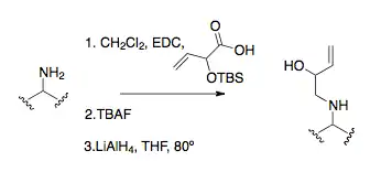 The ring strain of epoxides provide useful methodology for installation of an amine group two atoms away from an alcohol group. The epoxide may be first broken by bromide nucleophilic attack. Primary amines, aromatic amines, or lithium anilides can also be used as nucleophiles. Protective O-methylation often follows this step and proceeds easily.