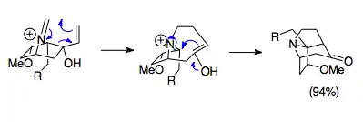 Horowitz and Geissman's first example demonstrates a possible thermodynamic sink to couple with the cationic 2-aza-Cope rearrangement, where the product is biased by the phenyl substituent through aryl conjugation, then captured by hydrolysis of the iminium. Other methods of biasing a product include using substituents which are more stable on substituted carbons, releasing ring strain (for instance, by pairing the rearrangement with cyclopropane opening), intramolecular trapping (pictured), and pairing the rearrangement with the Mannich cyclization.[1][15]
