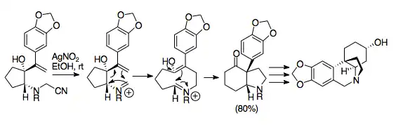 Crinine is an alkaloid of the family Amaryllidaceae, and its asymmetric total synthesis was one of the first using the aza-Cope/Mannich reaction. This synthesis represents a significant step in the development of the aza-Cope/Mannich reaction, as it takes advantage of several of the most useful synthetic strategies characteristic of the reaction. This reaction takes advantage of the cationic-2-aza-Cope rearrangement's high diastereoselectivity, as well as usage of the cyanomethyl group to protect the amine during vinyllithium addition and as a leaving group to promote iminium formation, assisted by addition of silver nitrate.[22] This synthesis is one example of many of the cyanomethyl group providing a synthetically useful route towards pyrrolidine and indolizidine formation.