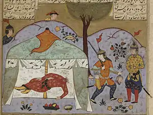 Azen Gushnasp was a native of Khuzestan, and is also called "Khuzi" by al-Mas'udi and Gardezi. He belonged to the arteshtaran class. It seems that when the Sasanian military commander Bahram Chobin won a great victory over the Turks, Azen Gushnasp reportedly became jealous and accused the general of having kept the best part of the booty for himself and only sending a small part to Hormizd IV.[1] According to other sources, however, it was the captive Turkic prince Birmudha or the courtiers that raised Hormizd's suspicion. Regardless, Bahram Chobin was later dismissed by Hormizd, which resulted in the latter starting a major rebellion.[1] Azen Gushnasp was sent to suppress the rebellion, but was murdered in Hamadan by one of his own men, Zadespras.