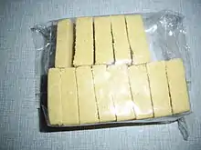 Bánh đậu xanh (chữ Nôm: 餅豆靑, mung bean pastry) is a type of bánh in Vietnamese and Chinese cuisine.[1] It is a specialty of Hải Dương province. Lüdou gao (绿豆糕, mung bean pastry) and lüdou huang (綠豆黄) are two types of mung bean pastries, with the former being dry and the latter being wet and fermented.