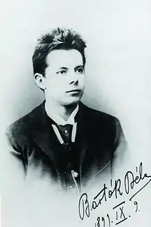In 1888, when he was seven, his father, the director of an agricultural school, died suddenly. His mother then took Béla and his sister, Erzsébet, to live in Nagyszőlős (present-day Vynohradiv, Ukraine) and then in Pressburg (Pozsony, present-day Bratislava, Slovakia). Béla gave his first public recital aged 11 in Nagyszőlős, to positive critical reception.[9] Among the pieces he played was his own first composition, written two years previously: a short piece called "The Course of the Danube".[10] Shortly thereafter, László Erkel accepted him as a pupil.[11]