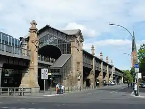 Heavily damaged by air raids and the Battle of Berlin on 22/23 November 1943 and 19 July 1944, the station was rebuilt after World War II, but went out of service in 1972 due to the interruption of the U2 line by the construction of the Berlin Wall. The building then hosted a bazaar in discarded U-Bahn cars, until in 1993 the eastern and western parts of the U2 were reconnected.[3]