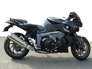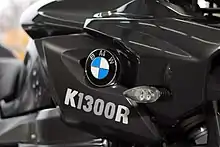 The BMW K1300R is a naked motorcycle made by BMW from 2008 to 2015. When launched, it replaced the K1200R as BMW's flagship urban motorcycle. BMW says the K1300R produces 173 hp (129 kW) @ 9,250 rpm and 140 N⋅m (100 lbf⋅ft) torque @ 8,250 rpm from its 1,293 cc (78.9 cu in) inline-four engine.[1] The engine was subtly modified by British company Ricardo plc.[2] It has an exhaust butterfly flap to boost torque and improve exhaust note.[3] The K1300R features BMW's optional ESA-II electronic suspension adjustment. The bike also has a conventional indicator switch instead of the usual BMW three button configuration.