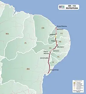 BR-110 is a federal highway of Brazil.[1] The 1091 kilometre road connects Areia Branca to Catu.[2]