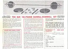 BUR-140 – The “BUR-140” is arguably the best known BUR product. It replaced the BUR-130.[16] Unlike previous BUR sets, the BUR-140 came with a 38-inch chrome-plated and knurled revolving barbell sleeve. This sleeve increased the grip diameter of the 5-foot (1.5 m) steel bar from 1" to 1-1/8”. The set's dumbbells also included removable revolving sleeves. Finally, the BUR-140 came with BUR's own oversized inner collars; these collars were machined to allow the bar sleeve to rotate freely while simultaneously eliminating the gaps between sleeve and collars that were common at the time. According to BUR brochures, the new bar could support a maximum weight of 400-pounds. The BUR-140 sold for $16.80 in the early 1950s (about $140 in 2010 adjusted dollars) and was still being produced when the company closed in the 1960s.[17]