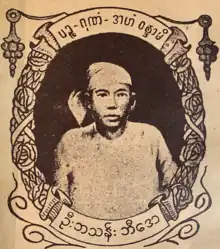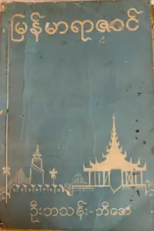It was then that he wrote his most famous book, Myanmar Yazawin, intended to be a high school textbook on Burmese history. It was based on his many years' experience as a history teacher, and the research he had done over the years. He had consulted several Burmese chronicles, primarily Hmannan Yazawin and Maha Yazawin, Burmese history books written by British historians (including A.P. Phayre, S.W. Cocks and G.E. Harvey) as well as English translations of Siamese and Lan Na history.[6] He had wanted to bring a more complete textbook than those in use at the time when most Burmese vernacular schools used a Burmese translation of Cocks's A Short History of Burma or an abridged version of the Hmannan chronicle by Ba Tin of Mandalay.[5] He finished writing the book in 1929 in Kangyidaunt,[7] and the book was published in 1930.[3]