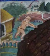 ![]() Detail of Baba Wali Kandhari from a fresco depicting Guru Nanak stopping the huge boulder by his palm at Hasan Abdal (site of Gurdwara Panja Sahib), circa 19th century | |