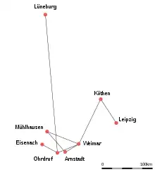 - ↑ Archival research in the twenty-first century has thrown light on the two houses where Bach lived in Köthen. Information der Stadt Köthen (Anhalt) zu den zwei Bachhäusern in Köthen Archived 13 March 2016 at the Wayback Machine