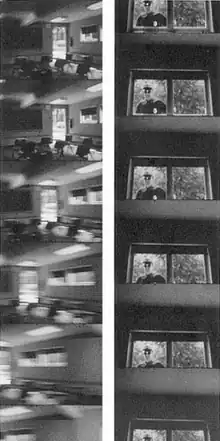 The first section shows a pan across a building’s exterior as a person walks into frame. A cut to a classroom interior shows a pan continuing the same movement along a fixed arc, both endpoints of which are signaled by the sound of the camera hitting a wooden stop arm. For most of this first section, the pans occur with the same frequency. Figures appear at various points in the field of view described by the pan’s arc (often on-camera, at one of the pan’s endpoints, but potentially also at any point in-between, either on- or off-camera). Three-quarters into this section, the pans begin to accelerate, until the image blurs.