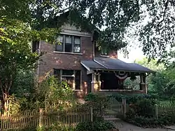 It is a simple two-story L-shaped masonry structure, with a cross-gable roof configuration and a porch at the crook of the L. The front-facing gable has Craftsman-style brackets and half-timbering effects. The porch has a shed roof, and is supported by groups of short box columns set on tall brick piers, with a brick balustrade. The house was designed by the architect Charles L. Thompson, and was built about 1915.[2]