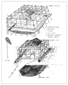 Bagan is made up of several components: Nets, shack (made of woven or wooden material, sometimes without roof), serok (handle net) and lights. The nets are generally 9 x 9 m wide, with 0.5 – 1 cm mesh, made of cotton or nylon yarn. These nets are fastened to a rectangular frame made of bamboo or wood. The shack (anjang-anjang) is made of bamboo/wood whose underside is 10 x 10 m, while the upper part is 9.5 x 9.5 m (for stationary bagan). At the deck there is a roller to lower and lift the net. Catching with a bagan is only done at night (light fishing), especially on the dark moon phase by using lights as fishing aids.[1]