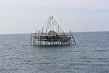 Bagan or bagang is a fishing instrument (lift net) that uses nets and lights so that it can be used for light fishing, originating from Indonesia.[1] Bagan is floated out to the sea to catch fishes, squids, and shrimps, and remain in the sea for several days or even months. The catch would be transported to land using other boats.