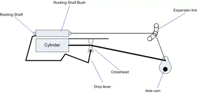 The valves are driven from an eccentric cam mounted on one of the driving axles and linkage from the crosshead. The driving axle cam drives a rocking shaft that is mounted inside a cylindrical sleeve (known as the rocking shaft bush) above the cylinder. A drop lever and connecting link from the crosshead oscillates the sleeve to control the lap and lead of the cylinder.[1]