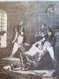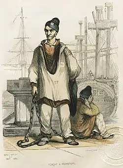 An iron ring, called manille, was attached to one ankle. Attached to the manille was an iron chain with eighteen links. The ring and the chain together weighed seven kilograms and 250 grams. There were longer chains, of twenty-four links, for those with longer sentences, and for those sentenced to life imprisonment, an additional triangular ring so they could be chained to their bed.[10] Before the French Revolution and again after 1810, the prisoners were also branded on the shoulder with a hot iron, using the letters TF (travaux forcés, hard labour) and TFP (travaux forcés à perpétuité, hard labor for life).