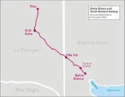 The Bahía Blanca and North Western Railway (Spanish: Ferrocarril Bahía Blanca al Noroeste) was a British-owned railway company that operated in Argentina. The original project was the rail line to run through the provinces of Buenos Aires, Córdoba and San Luis, tracks were only extended to Toay in La Pampa[3] and Huinca Renancó in Córdoba.[4] The BB&NWR was also the first railway line to reach La Pampa.[5]