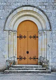 [45] The columns of the north wall are Romanesque while those of the south wall are clearly Gothic and date from the 13th century. The tower gate was built in the 19th century and replaced a simple pediment bell tower which had two bells. There is a remnant of an arch and the start of some vaults from the 13th century. Inside the church there is a stained glass window representing Saint Radegund, wife of Chlothar I. The priory contains many items that are registered as historical objects: