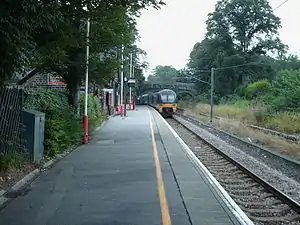 The line has been reduced to single track, so there is only one platform, and the station building has been sold. The second platform is disused and covered in weeds.