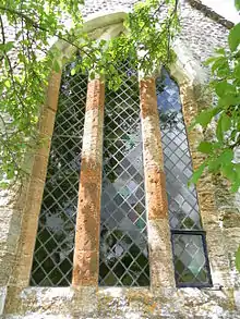 The chapel is a simple Gothic building of the 13th century.[4] The single-cell rectangular structure is dominated by a large three-light east window in the form of a lancet with cusping.[1][2][3] Smaller single-light lancets remain in the north and south walls.[2] The exterior is built of flint, rough stones and cobbles, some of which came from the original 11th-century chapel, and the sloping roof is laid with tiles.[1][4] Inside, there are arches whose capitals are carved with foliage decoration[1] and a mass dial dating from the medieval era. This was found on the beach nearby, and had apparently washed up from the submerged remains of the old church at Atherington.[3] The ashes of Lord Moyne and his wife Lady Evelyn were originally interred in the chapel, but they are now in a tomb in St Mary's Church, Climping.[1]