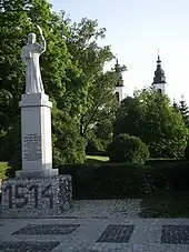 During World War II nearly 90% of all Bakałarzewo buildings were destroyed by 1945. During the German occupation, the Germans arrested the local parish priest Antoni Romuald Jałbrzykowski in late 1939, then imprisoned him in Stary Folwark and Suwałki until January 1940 and murdered him in the forest near the village of Krzywe.[3] Young Polish priest Kazimierz Hamerszmit was arrested in April 1940, and then imprisoned in the Soldau, Sachsenhausen and Dachau concentration camps, however, he survived and eventually returned to Poland.[4] The Germans operated two labour camps of the Reich Labour Service in Bakałarzewo.[5] Bakałarzewo was an important center of the Home Army, and on 25 May 1944, German soldiers killed 12 Home Army members (see Nazi crimes against the Polish nation). The village has preserved World War II bunkers now housing a museum.