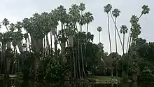 ![]() Looking north across Baldwin Lake from near the Queen Anne Cottage at the Los Angeles County Arboretum and Botanic Garden. California native fan palm trees (Washingtonia filifera) and Mexican fan palm trees (Washingtonia robusta) line the north shore.[1] | |