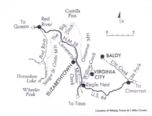 The Baldy Mining District was one of the largest gold producing districts in New Mexico.[1] Also sometimes known as the Elizabethtown Mining District, it encompasses Baldy Mountain (Colfax County, New Mexico).[2] There is no longer any large scale mining. Most of the land is now owned by the Boy Scouts of America as a part of Philmont Scout Ranch.[1] The Baldy Mining District is approximately 18,247 Acres.[2]