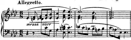 The mezza voce section soon develops into a furious F minor chordal section and once again returns to A♭. The mezza voce section is repeated, following by a new theme consisting of right hand sixteenth-note leggiero runs. The following return of the broken octave theme is transposed from C to A♭ (the repeated Cs now being A♭s). The key signature then shifts to C♯ minor. The original "B" theme is then developed, this time using rapid, chromatic left-hand runs in the left hand under large chords in the right. This theme builds to a climax through rapid repetition of broken G♯ octaves (referencing the mezza voce theme) with fragments of the "C" theme in the left hand.