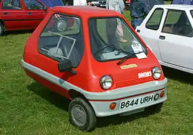 The Bamby featured a fibreglass body with left side gull-wing door. All Bamby cars were three-wheelers with the single wheel in the rear. Initial models were equipped with hand-started Minarelli 49 cc (3.0 cu in) engines, cable brakes and single headlamps. Improvements introduced included replacing the original engines with the type fitted by Yamaha to their Passola moped, using the main frame components as a subframe for attaching to the body of the car. Brakes were converted to hydraulic discs, but the single headlamp was retained until a further face-lift, from which time two headlights were fitted. At this time the gull-wing entry was deleted and a front-hinged door installed instead. Also introduced was a Suzuki engine, attached via a full chassis, in place of the previously used subframe. Like the Peel P50, there was no reverse gear. The new model was exhibited at the Ideal Home Exhibition of 1984, meeting with overall public approval, but few were made and the final Bamby left the factory within a few months.[1]