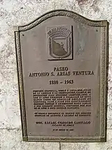 Paseo Arias was previously called Callejón Amor (Love Alley). In 1991, Callejón Amor was converted into a promenade and renamed Paseo Antonio S. Arias Ventura, after the long-time employee of Banco Crédito y Ahorro Ponceño who started as a custodian and rose to become the bank's general manager.[12][13]