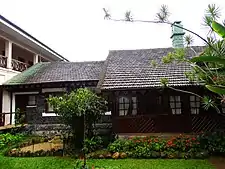 The century-old British-built property is associated with the development of the hill-country railway and is situated within walking distance from the railway station. Bandarawela Hotel's origins date back to the turn of the 19th / 20th century when the railways were being extended by the British from Nanu Oya to the southern highlands as a Railway Hotel.[4] The foundation stone for the building was laid in 1893 for a tea planter's club.[2][5] It was subsequently converted into a rest house and was used as a sanitarium by British soldiers and officers recovering from the Second World War.[6] In 1938 there was a refurbishment and extension of the building to its present capacity. The hotel had a 'European Only' policy until Sri Lankan independence in 1948.[2][7]