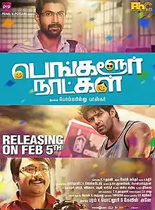 Bangalore Naatkal (transl.Bangalore Days) is a 2016 Indian Tamil-language comedy drama film directed by Bommarillu Bhaskar, which is a remake of the 2014 Malayalam film Bangalore Days written and directed by Anjali Menon. Featuring an ensemble cast consisting of Sri Divya, Bobby Simha, Arya, it tells the story of three cousins who live their childhood dream of living and enjoying in the city of Bangalore. It also stars Rana Daggubati, Parvathy Thiruvothu (who reprises her role from the original), Raai Laxmi, Paris Laxmi, Prakash Raj in other pivotal roles. Samantha Ruth Prabhu appears in a cameo. Produced by Prasad V Potluri under his banner PVP cinema, the film released on 5 February 2016. Unlike the original, this movie received mixed reviews and failed at the box office with critics and fans drawing comparisons with the original.