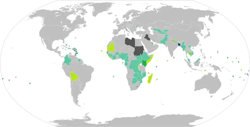 As of 12 January 2024, Bangladeshi citizens who hold regular or ordinary Bangladeshi passports have visa free or visa on arrival access to 42 countries and territories, ranking the Bangladeshi passport 97th in terms of travel freedom (along with North Korea) according to the Henley Passport Index.[21] Bangladeshi citizens who hold Diplomatic passports or Official passports of Bangladesh have visa free or visa on arrival access to many more countries.[22] Previously, Bangladeshi passports were not valid for travel to Taiwan, Rhodesia, South Africa and Israel but that has long changed.