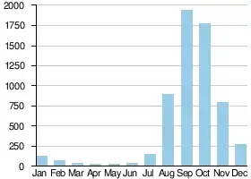 The annual rainfall varies across the catchment basin with the southern area in Côte d'Ivoire receiving 1,500 mm (59 in) a year while the northern area around Douna[1] receiving only 700 mm (28 in).[4][5][6] For the period 1965-1995 the average annual rainfall for the basin was 1,100 mm (43 in).[7] The rainfall is seasonal with most of the rain falling between May and October. The maximum rainfall occurs in August.
