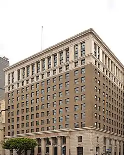 The 12-story building was completed in 1922,[3] and it was dedicated in 1923.[4] It was built as the Los Angeles headquarters of the Bank of Italy, a forerunner to Bank of America founded by Amadeo Giannini.[4] It was designed by the architectural firm Morgan, Walls & Clements,[3] in the Neoclassical architectural style with "Doric columns, ornate golden ceiling and marble floors."[4] The bronze front doors are surrounded by terra cotta sculptures of American coins.[5]