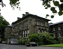 When Edward Akroyd (1810–1887) bought this building in 1838, on his engagement to Elizabeth Fearby of York, it was a much smaller eight-roomed house, built c. 1800.[1] He and his brother Henry were working for their father Jonathan Akroyd, a rich worsted mill owner, and living at Woodside Mansion in Boothtown. Jonathan died in 1848, and it was possibly Edward's inheritance which paid for the development of Bankfield which began around this time. Edward encased the 18th-century building in fairfaced stone and added two loggias, a dining room, Anglican chapel and kitchens.[2]