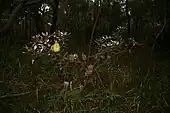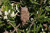 Flowering has been recorded between January and October, with a peak in autumn and early winter (April to June).[6] The inflorescences, or flower spikes, arise from the end of 1 to 5 year old branchlets, and often have a whorl of branchlets arising from the node or base. Measuring 5–15 cm (2.0–5.9 in) high and 4 cm (1.6 in) wide, the yellow spikes often have blue-grey tinged limbs in bud,[3] though occasionally pinkish, mauve or mauve-blue limbs are seen.[7] Opening to a pale yellow after anthesis, the spikes lose their flowers with age and swell to up to 17.5 cm (6.9 in) high and 4 cm (1.6 in) wide, with up to 80 follicles. Covered with fine fur but becoming smooth with age, the oval-shaped follicles measure 1–1.8 cm (0.39–0.71 in) long by 0.2–0.7 cm high (0.1–0.3 in) and 0.3–0.7 cm (0.12–0.28 in) wide.[3] The bare swollen spike, now known as an infructescence, is patterned with short spiky persistent bracts on its surface where follicles have not developed.[5] Each follicle contains one or two obovate dark grey-brown to black seeds sandwiching a woody separator. Measuring 1.2–1.8 cm (0.47–0.71 in) long, they are made up of an oblong to semi-elliptic smooth or slightly ridged seed body, 0.7–1.1 cm (0.28–0.43 in) long by 0.3–0.7 cm (0.12–0.28 in) wide. The woody separator is the same shape as the seed, with an impression where the seed body lies next to it.[3] Seedlings have bright obovate green cotyledons 1.2–1.5 cm (0.47–0.59 in) long and 0.5–0.7 cm (0.20–0.28 in) wide, which sit on a stalk, or 1 mm diameter finely hairy seedling stem, known as the hypocotyl, which is less than 1 cm high. The first seedling leaves to emerge are paired (oppositely arranged) and lanceolate with fine-toothed margins, measuring 2.5–3 cm long and 0.4–0.5 cm wide. Subsequent leaves are more oblanceolate, elliptic (oval-shaped) or linear. Young plants develop a lignotuber in their first year.[3]