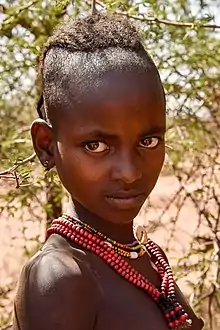 The Banna people, also Banya, are an Omotic ethnic group in Ethiopia that inhabit the Lower Omo Valley, primarily between the Weyto and Omo rivers. They live in an area between the towns of Gazer and Dimeka, with the traditional area of the Banna being divided into two ritual regions: Ailama (around Gazer) and Anno (spanning from Benata to Dimeka).[1] According to the 2007 census, they number at around 47,000 individuals. They engage primarily in agriculture and supplement this by pastoralism, hunting, and gathering. They are mainly Muslim, however, several thousand are Christian, and they have their own king.[2]