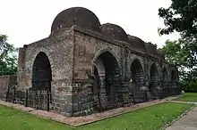Zafar Khan Ghazi Mosque and Dargah situated at Tribeni in Hooghly district, West Bengal, India, are considered to be among the earliest surviving Muslim monuments in Bengal. According to an inscription, the mosque is dated 698 AH (1298 AD). Tribeni (junction of three rivers viz, the Ganges, the Yamuna, and the Sarasvati - hence the name) was an ancient holy place of the Hindus. The Muslims conquered it during the early phase of their conquest of Bengal. The mosque is an oblong structure measuring 23.38 by 10.53 metres (76.7 by 34.5 ft) externally. It is the earliest surviving example of the brick-and-stone style introduced by the Muslims in Bengal in place of the traditional Hindu style of laying rectangular cut stones one upon another without mortar. The stones used in the mosque were originally materials from temples, as evidenced by figures of Hindu deities carved on some pieces. The original structure has suffered reconstruction a number of times.