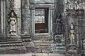 The second enclosure, which is part of the main temple, measures 58 m × 50 m (190 ft × 164 ft). It has a gopura on its eastern side and also subsidiary gopura on the west. Entrance doors are at the northern and southern ends.[4] The gopura is built like a gallery with one exterior wall and double row of pillars which open into a courtyard and which has mostly shored up walls with small openings at the bottom to allow air circulation. The niches here are decorated with images of apsaras, and a Buddha statue in the central hall has been defaced by vandals. Bayon style architectural features built-in are the "balustered false windows with lowered blinds and devatas with headdresses in the form of small flaming discs set in a triangle." The vaults built in sandstone and laterite have collapsed at several locations of the gallery.[12] The inner enclosures contain library building to its north and south and also a central sanctuary.[7]