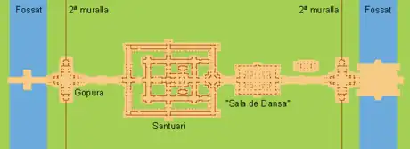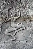 The third enclosure has a gopura which has a cruciform plan. It has pillars which are crossed by vaults. There are three passages in this enclosure, two on either side are independent, with laterite walls. The niches here have small figurines, and large apsara devatas in single poses or in pairs of dancing poses. Large Buddha images, in an internal courtyard of this enclosure, have been defaced by vandals. A paved access from here leads to the main shrine, which comprises two galleried enclosures. At the entrance to these enclosures, from the eastern end, is the "Hall of Dancers", which has four open courtyards and the pillars have fine carvings of apsaras.[12]