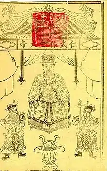 Wu Tao or Wu Ben[1] (吳本) was born in the village of Bailiao near Xiamen in Fujian Province, during the Song dynasty in the year 979.[2] He was a skilled doctor and Taoist practitioner who was credited with performing medical miracles, including applying eye drops to a dragon's eye and removing a foreign object from a tiger's throat.[3] After his death in 1036, he began to be worshiped as a deity. His deified status was officially recognized by the Hongxi Emperor of the Ming dynasty who conferred on him the title of “Imperial Inspector at Heavenly Gate, Miracle Doctor of Compassion Relief, Great Taoist Immortal, and the Long-lived, Unbounded, Life Protection Emperor (恩主昊天金闕御史慈濟醫靈妙道真君萬壽無極保生大帝)”.[4]