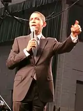 On March 8, 2008, Obama won the Wyoming caucus by nineteen points.[136] The Clinton camp continued to suggest that Obama would make a good vice presidential candidate for Clinton, and former President Bill Clinton made known his support of this as a "dream ticket" which would be an "almost unstoppable force".[137] On March 10, Obama flatly rejected such suggestions.[138] Obama noted that he, not Clinton, held the lead in pledged delegates and that he had won more of the popular vote than Clinton. "I don't know how somebody who is in second place is offering the vice presidency to somebody who is in first place", he said.[139] He told supporters in Columbus, Mississippi, that Clinton's VP suggestion was an example of what he called "the old okey-doke", further stating that the Clinton camp was trying to "bamboozle" or "hoodwink" voters.[140] Obama wondered aloud why the Clinton campaign believed him competent for the vice presidency, but said he was "not ready" to be president.[141] Obama stated that the nomination process would have to be a choice between himself and Clinton, saying "I don't want anybody here thinking that 'Somehow, maybe I can get both'," by nominating Clinton as president and assuming he would be her running mate".[142][143] Some suggested that it was a ploy by the Clinton campaign to denigrate Obama as less qualified for the presidency.[144]