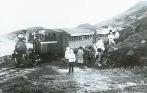 Due to large storms in December 1896, long sections of the track became unusable because of erosion and flooding and had to be rebuilt completely.[4] In the subsequent two years until 1898, the rail track was re-gauged to the new gauge of 762 mm (2 feet 6 inch) by the internationally recognised railway specialist Everard Calthrop.[3] New Baldwin locomotives and passenger cars were imported from the United States. The success was only short-lived, as the operators went into financial difficulties again when the governmental subsidies faded out. The railway was temporarily closed in 1904, while the liquidators tried to find another investor.[4]