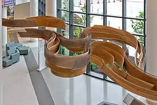 Cooper has created several large-scale commissioned public works melding her sculptural concerns with qualities specific to their spaces.[42][43] Current (2007, Chicago Public Library, Avalon Branch) is a 20-foot-long horizontal, suspended sculpture of layered, undulating wood forms that echo the layering of pages and collected books and suggest the ripple effect of learning on a community.[12][42] Ecotone (2013, Florida Gulf Coast University Library) and Circuit (2015, Hinsdale Public Library) feature spiraling, wood-and-metal ribbon forms that reference, respectively, the overlapping of communities and habitats[42][43] and the flows of technology, electronics, information and transportation.[13] Pneuma (2019, Pro Medica Generations Tower, Toledo) uses similar means to embody connections and tensions between physical and spiritual and outer and inner, as well as the flow of elements and beings around obstacles during healing, transformation and growth.[44][42]