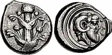Barca appears to be originally a settlement of the Libyan tribe Barraci. Later, Greek settlers from Cyrene colonized it and named it Barce (Βάρκη). Archaeological evidence shows that Greek presence at Barca goes back to the seventh century BC.[3] The city became a major economic centre, due to its agricultural wealth.[2] Herodotus places the foundation of the city around 560 BC, when the brothers of king Arcesilaus II of Cyrene quarrelled with him and left Cyrene to found Barca. The Barcans and Libyans defeated Arcesilaus II at the Battle of Leuco and killed him around 550 BC.[4] Before 515 BC, Arcesilaus III of Cyrene was driven into exile and came to Barca, where he was assassinated. As a result, his mother Pheretime called on the Achaemenid governor of Egypt, Aryandes, for help. He besieged and sacked Barca in 515 BC.[5][6] The Achaemenid king, Darius I, settled some of the Barcaean captives in a village in Bactria, which was still flourishing in Herodotus' time.[7][8] By the second half of the fifth century, Barca seems to been the dominant city in the region.[9]