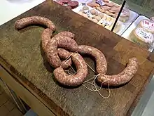 Bardiccio, also known as bardiccio fiorentino,[1] or salsiccia matta[2] is a typical Tuscan cold cut, similar to burischio,[3] whose preparation is based on the use of the less valuable and rich in blood parts[4] of pork. Its typical dark red color depends on the quantity of heart - generally bovine - used in the mixture. Bardiccio has the characteristic shape of a sausage, but it is longer and is stuffed into a pork casing, tied with string. It is produced from September to May and is eaten unaged.[5]